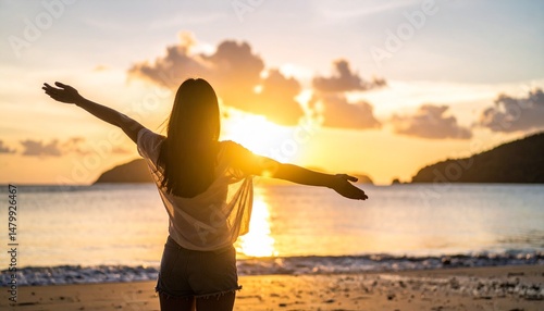 Kobieta stojąca na plaży na brzegu morza z szeroko rozłożonymi rękami. Radość, wakacje, wypoczynek, wolność, szczęście.