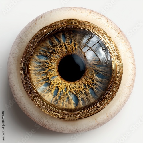 Lustrous gold metallic eye on plain bright white background no shadows, mystic symbol, detailed iris