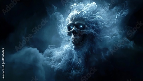 A dark, ghostly skull figure made of smoke, with glowing eyes and ethereal hair floating around it
