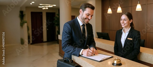 Businessman checking in at hotel reception desk with smiling female concierge in formal uniform. Concept of hospitality service, travel accommodation, business trip welcome, Copy space, Wide banner