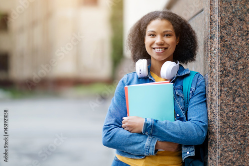 Black African American female student standing against a marble wall outdoors at campus, holding notebooks and wearing white headphones around her neck, happy black female looking at camera