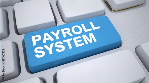 3D blue keyboard buttons with word payroll system, showing online hr payroll, payroll management setup, digital salary tracking in modern office