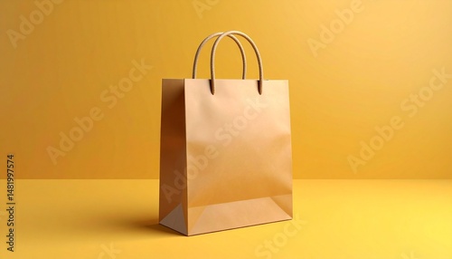 Shiny brown paper shopping bag standing against bright yellow background isolated studio shot