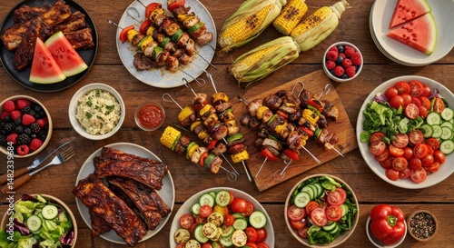 Barbecue spread with ribs, skewers, corn, salad, and watermelon for summer gatherings and outdoor events