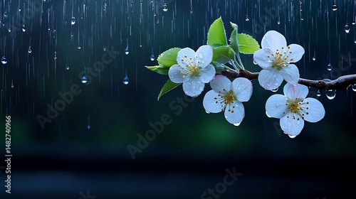 Delicate white blossoms on a branch during a light rain shower