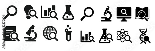 Collection of black research and science icons depicting various activities in a laboratory setting