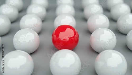 Unique red sphere stands out from white spheres. Concept business differentiation innovation, individuality, unique product. Visual representation of brand identity. Differentiation marketing,