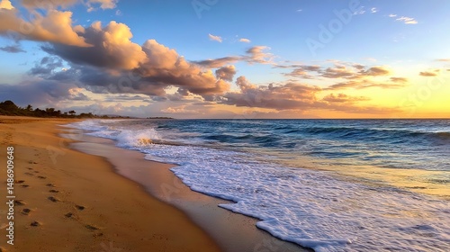 Beautiful beach scene with golden sand, crashing waves, sunset sky, blue clouds, and small wave rolling onto shore creating tranquil romantic atmosphere.