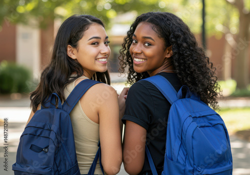 Two Diverse Happy Teenage Girls Walking Together with Backpacks on a College Campus