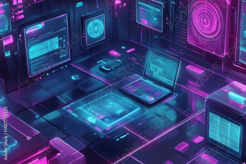 Cyberpunk scene with computer screens and neon lights displaying futuristic technology