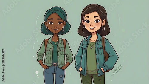 Two Diverse Teenage Girls Friends Cartoon Illustration