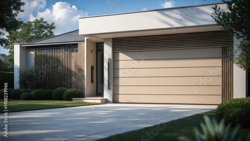 current house front with a shut garage door at the car access of a personal dwelling