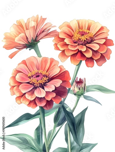 A trio of delicate peach zinnias blossoms in full bloom with a budding flower and lush green leaves against a clean white background.