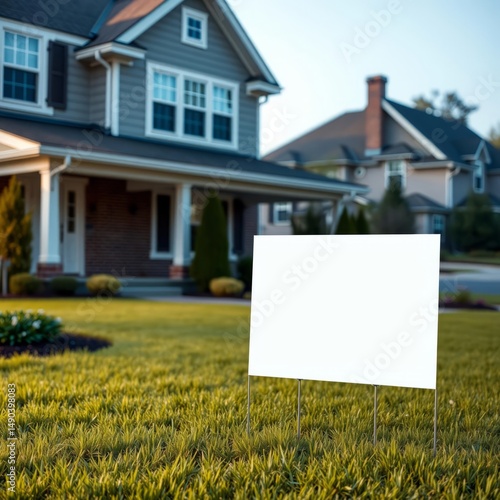 Empty yard sign stands in green grass in front of house blank sign ready for custom message real estate sign mockup property sale business advertisement potential excellent for marketing billboard bla