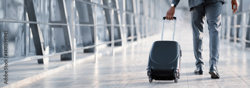 Cropped of African American Businessman At Airport Moving To Terminal Gate For Business Trip, Back View, Panorama With Copy Space