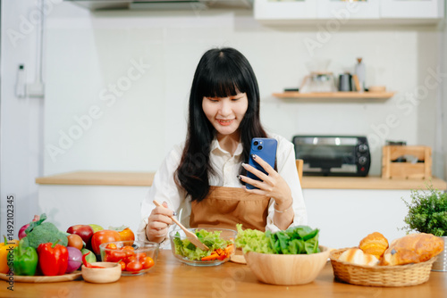 Asian woman preparing healthy food with smartphone in home kitchen. Great for wellness, clean eating, cooking content