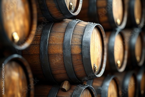 Close-up view of stacked wooden barrels with metal bands in a dimly lit storage area creating a warm and rustic atmosphere