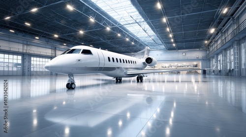 A sleek private jet parked inside a spacious, modern aircraft hangar with polished floors and bright lighting.