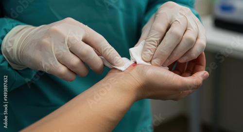 Doctor hands treating small wound on patient arm, Medical procedure close-up, Injury care process, Healthcare professional hands, First aid application