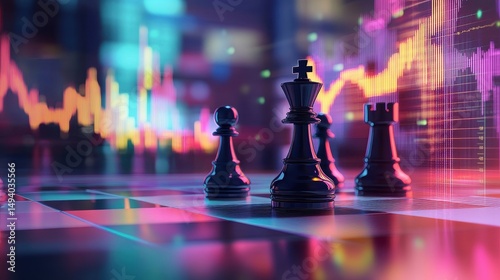 Investment strategy, chessboard with graph overlays, 3D illustration.