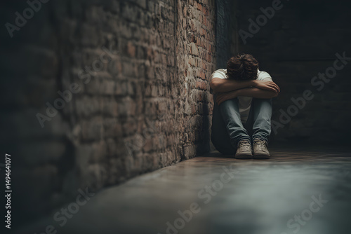 絶望と孤独を抱える若い男性が座り込む暗い路地