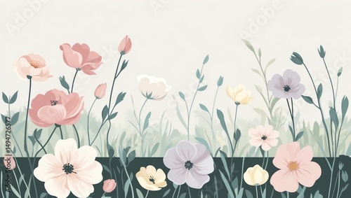 Delicate Floral Garden with Pastel Flowers and Green Grass Illustration