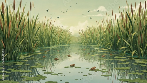 Tranquil wetland scene with swaying reeds soft frog croaks and dragonflies darting over waters surface