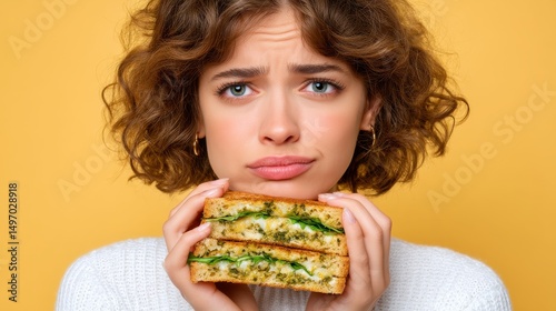 Young Woman Holding Moldy Sandwich Looking Disappointed Against Yellow Background