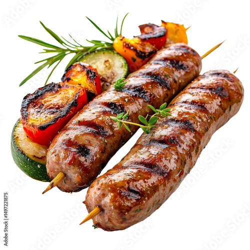 Grilled sausages served with colorful vegetables and herbs, showcasing delicious and appetizing meal. Perfect for barbecues and outdoor gatherings