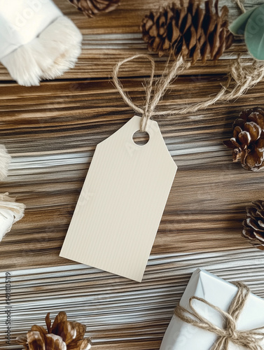 Etykieta z dziurką, przewiązana sznurkiem, wśród suchych roślin. Może służyć do oznaczenia prezentu lub produktu, nadając mu naturalny i stylowy wygląd.