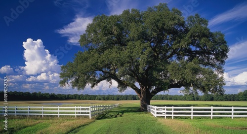 Land Trees. Large Tree Providing Shade in Front of White Fence on Georgia Farm