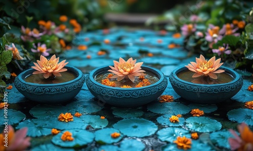 Trzy niebieskie misy z kwitnącymi liliami wodnymi na tle pływających liści