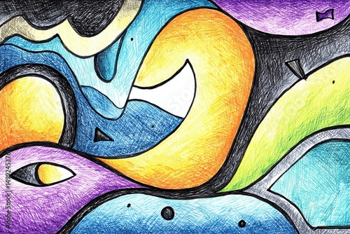 Abstrakcyjny rysunek ołówkiem i kredkami, kolorowe kształty, organiczne formy