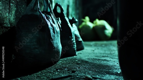 Zwiędłe worki na śmieci w ciemnym zaułku