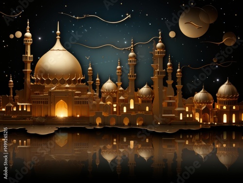 Złota nocna sceneria miasta, architektura islamska, styl papierowy