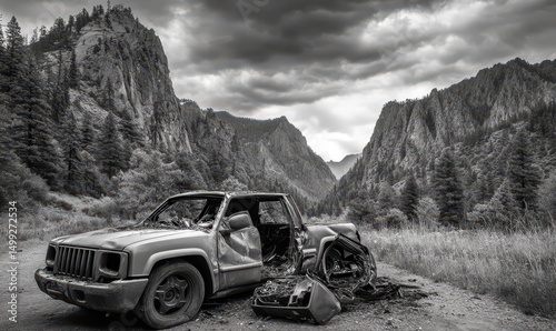 Czarno-białe zdjęcie samochodu terenowego w górskim krajobrazie