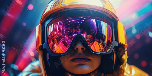 Portret osoby w goglach i kasku, neonowe światła
