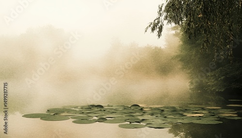 Mglista sceneria nad wodą z liśćmi lili wodnych