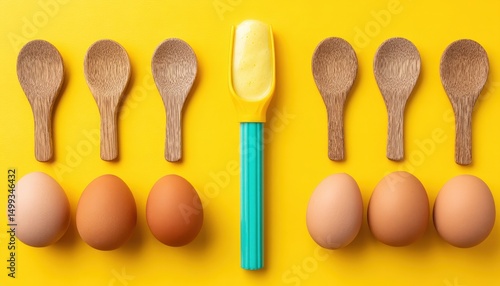 Drewniane łyżki i jajka ułożone symetrycznie wokół zielonego plastikowego przedmiotu na żółtym tle