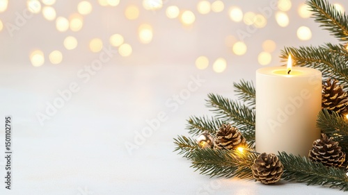 holiday christmas candlelight glowing among pine branches and pinecones, creating cozy Warm atmosphere with soft bokeh lighting
