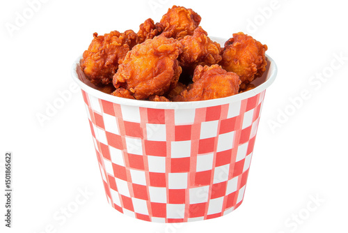 Crispy chicken bites overflowing from a redcheckered bucket against a stark white background