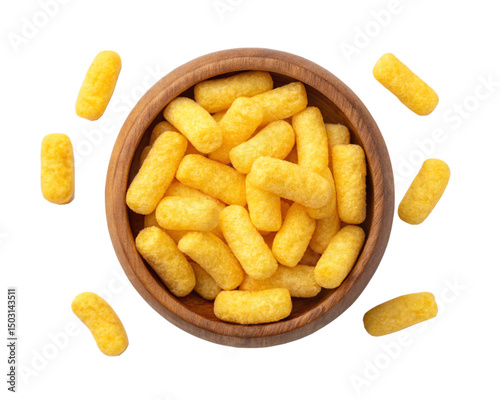 Delicious Cheese Puffs Snacks in Wooden Bowl Top View Crunchy and Golden Yellow