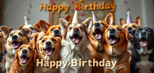 Joyful canine choir of diverse breeds sings "Happy Birthday", dog breeds, birthday