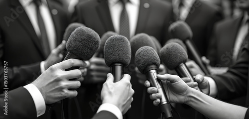 Close-up shot of journalists with microphones at press conference. Business or political meeting with media coverage. Public relations PR and media relations concept in business and politics.