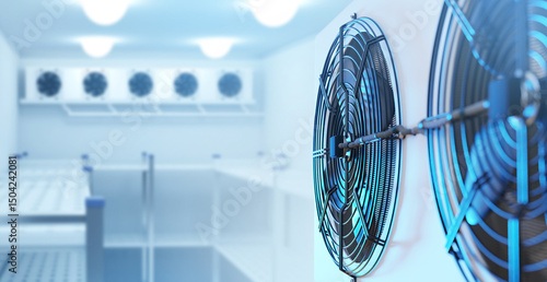 Industrial inside refrigerator. Warehouse refrigeration equipment. Freezer chamber. Conditioning unit in cold storage warehouse. Industrial refrigeration technology. Refrigerated warehouse. 3d image