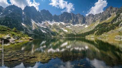 Serene mountain lake reflecting majestic peaks under blue sky
