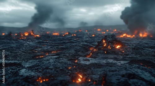 Scorched cityscape reveals charred ruins and glowing embers beneath somber skies, evoking a haunting atmosphere of desolation and despair