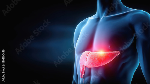 Pancreatic cancer concept showing human pancreas highlighted in red with glowing effect on dark background for medical study