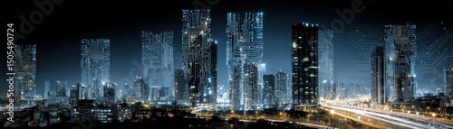A futuristic city skyline at night, with digital circuit patterns integrated into the skyscrapers, symbolizing smart technology and urban innovation.