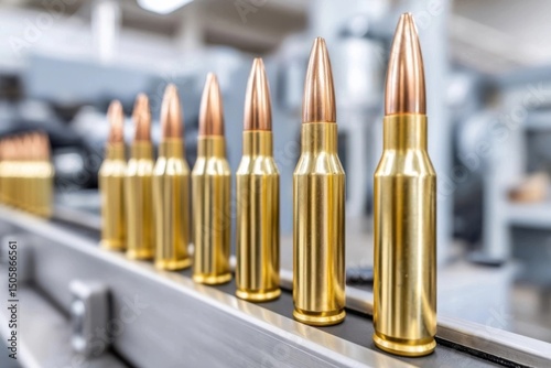Close-up of rifle cartridges on a conveyor belt, freshly manufactured ammunition in a factory setting.